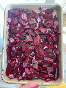 Wash and Peel 2-3 Beet's. Chop into any shape desired. Smaller pieces make for quicker cooking time and easier to eat in salads! Place all pieces on a sheet pan (lined with parchment paper if you have it). Chop up about one small onion (1/2 large onion) very thinly and toss add on top off beets.